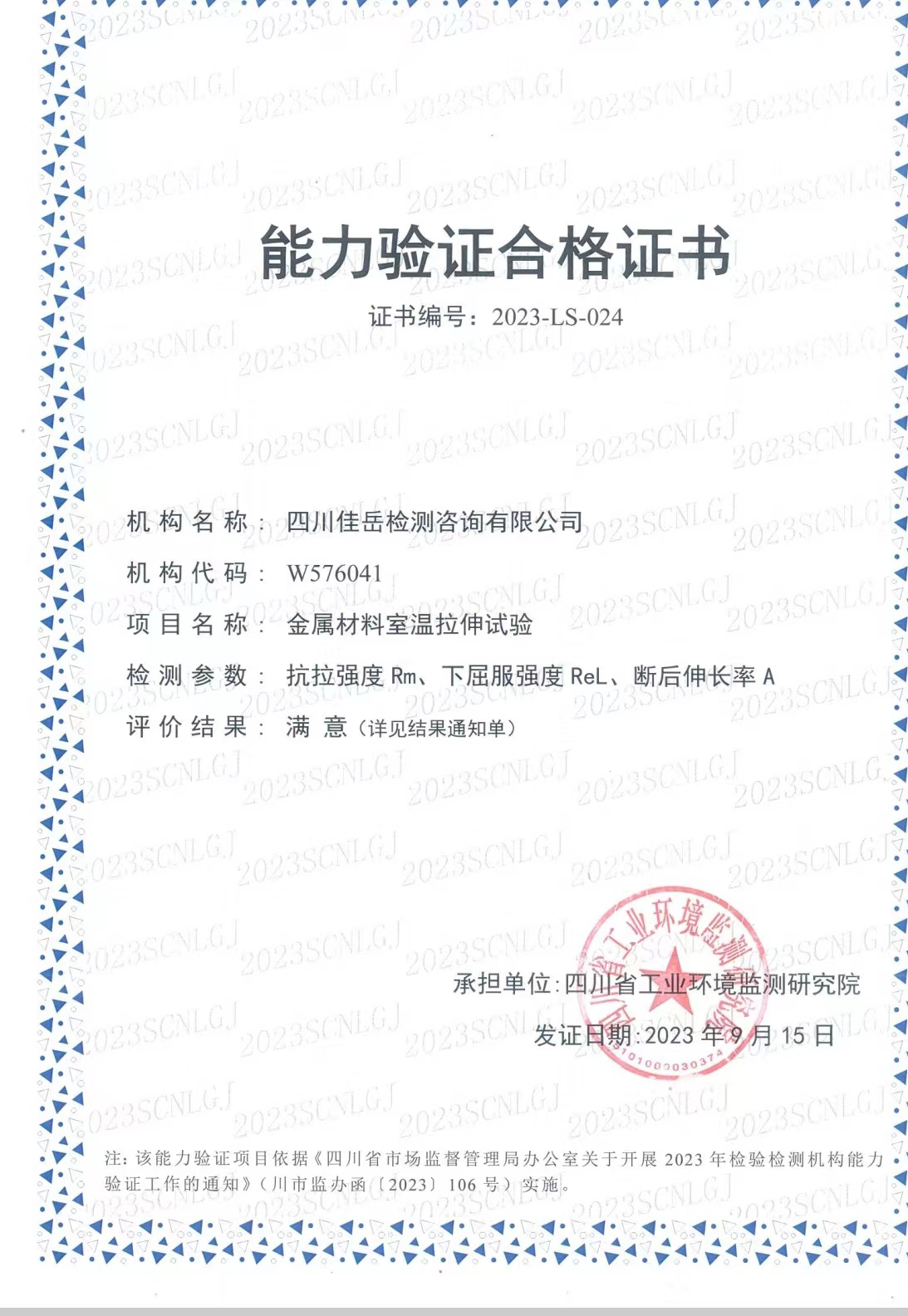 四川佳岳检测咨询有限公司顺利顺利获得2023年度省市场监管局能力验证
