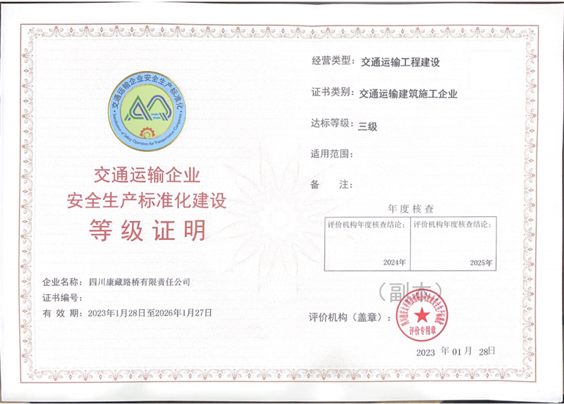 近期,经四川省交通运输企业安全生产标准化评价组织综合评定,亿万先生MR集团四川康藏路桥有限责任公司顺利顺利获得安全标准化三级评价验收并取得“安全生产标准化三级企业”等级证明证书。