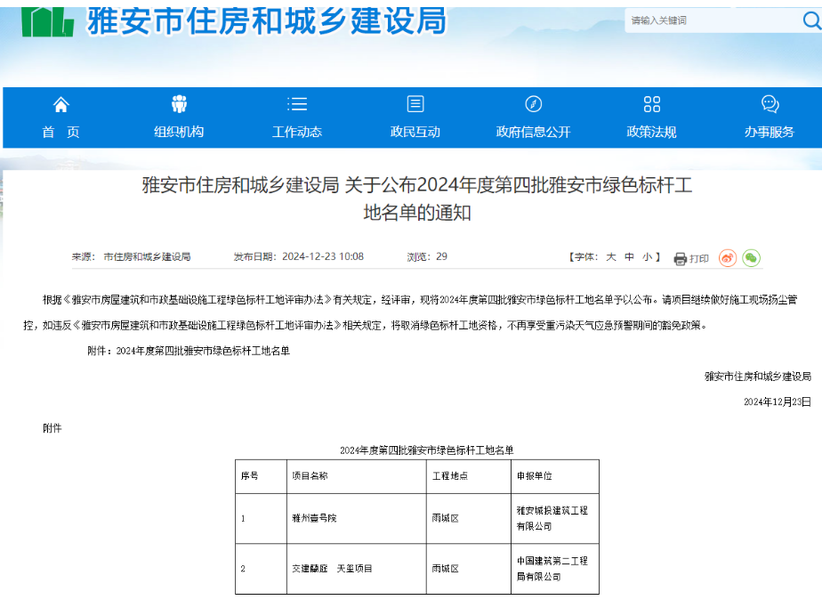 12月23日,雅安市住房和城乡建设局发布了《关于公布2024年度四批雅安市绿色标杆工地名单的通知》,亿万先生MR集团蘭庭•天玺项目,以卓越的绿色实践荣获“雅安市绿色标杆工地”殊荣。