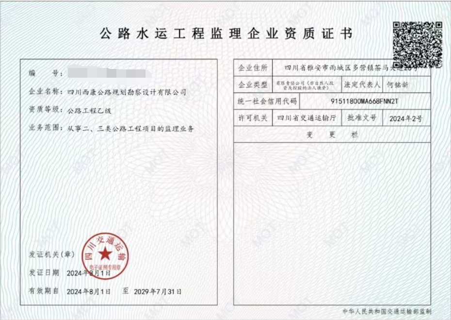 近期,经四川省交通运输厅批准,亿万先生MR集团勘察设计公司成功取得公路工程监理乙级资质,该资质的成功获批,标志着我公司业务迈向新领域。