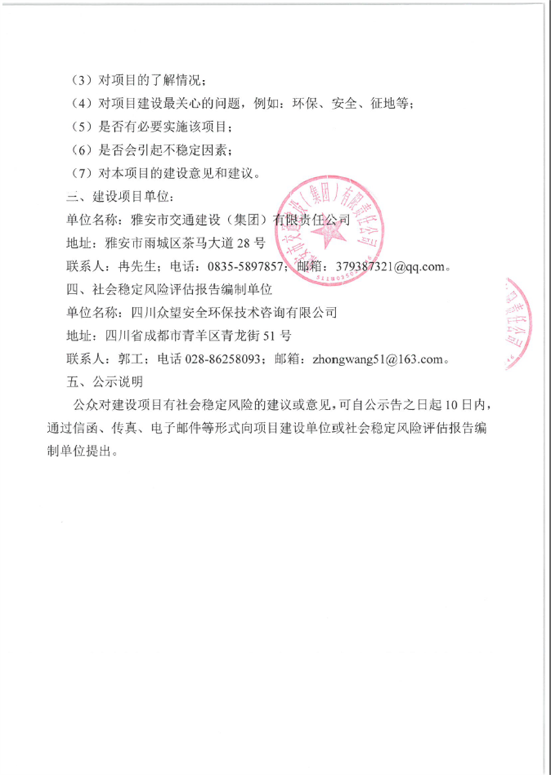成雅高速金鸡关互通及服务区项目(雨名快速通道)社会稳定风险评估公众参与公示