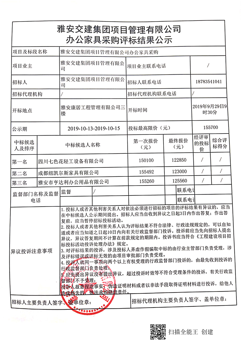 亿万先生MR集团项目管理有限公司办公家具采购评标结果公示