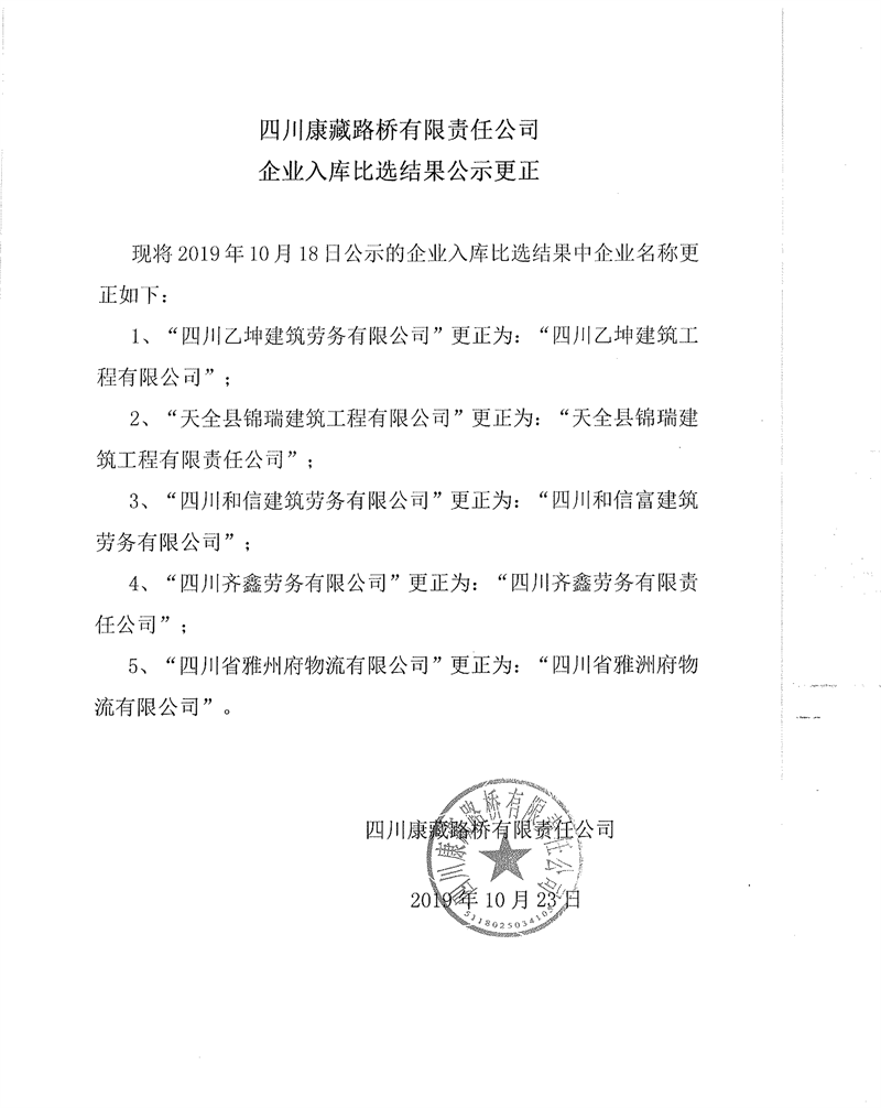 四川康藏路桥有限责任公司企业入库比选结果公示更正