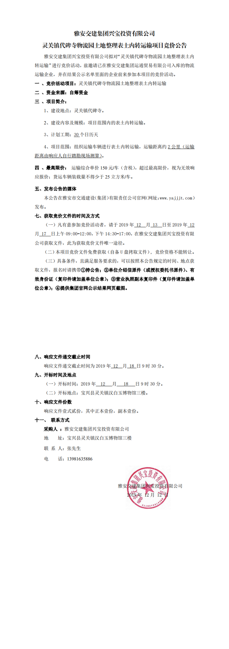 亿万先生MR集团兴宝投资有限公司灵关镇代碑寺物流园土地整理表土内转运输项目竞价公告