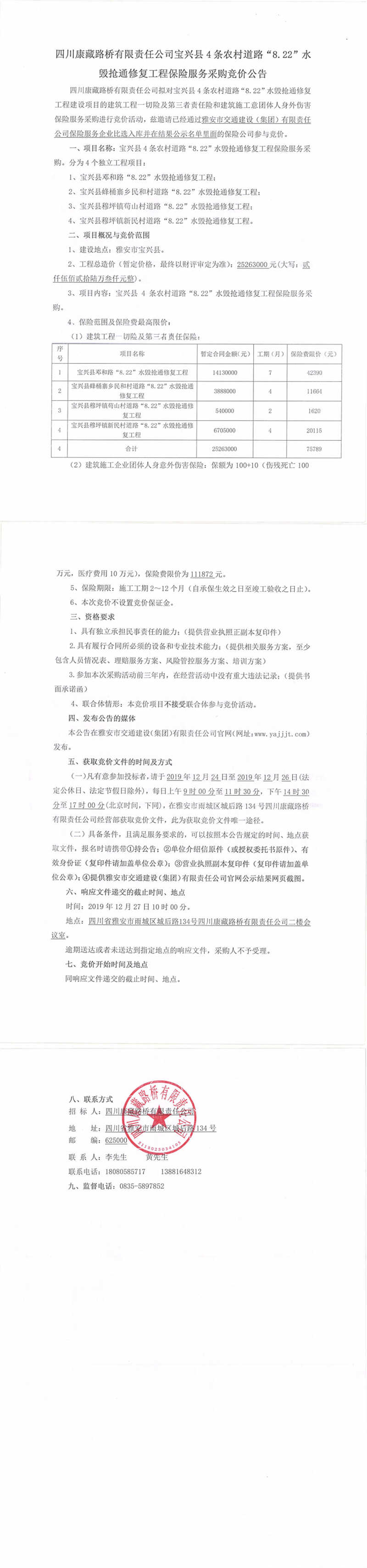 四川康藏路桥有限责任公司宝兴县4条农村道路“8.22”水毁抢通修复工程保险服务采购竞价公告