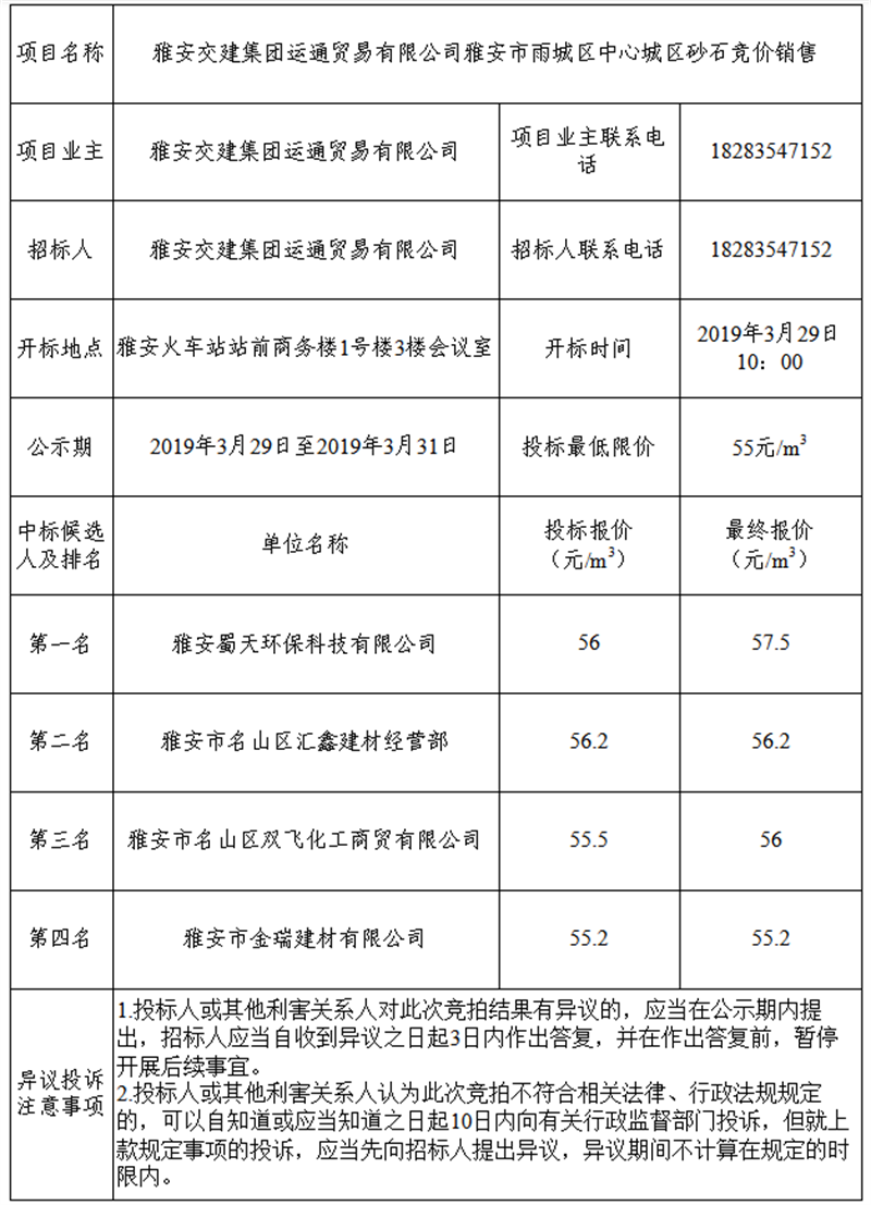 亿万先生MR集团运通贸易有限公司关于雅安市雨城区中心城区砂石竞拍结果公示