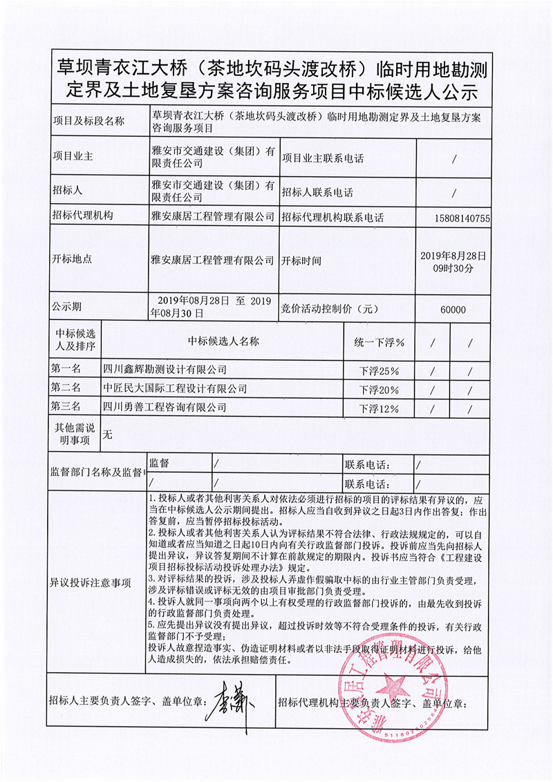 雅安市交通建设(集团)有限责任公司草坝青衣江大桥(茶地坎码头渡改桥)临时用地勘测定界及土地复垦方案咨询服务项目竞价结果公示
