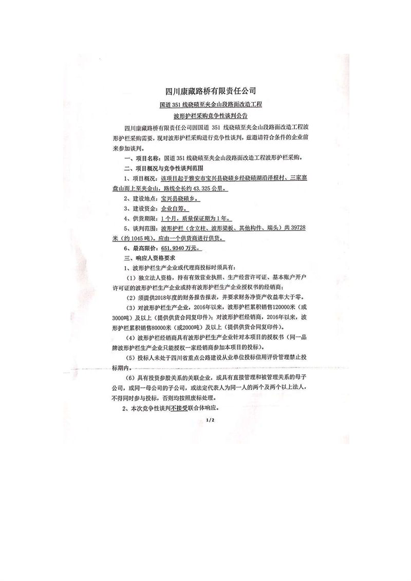 四川康藏路桥有限责任公司国道351线硗碛至夹金山段路面改造工程波形护栏采购竞争性谈判公告
