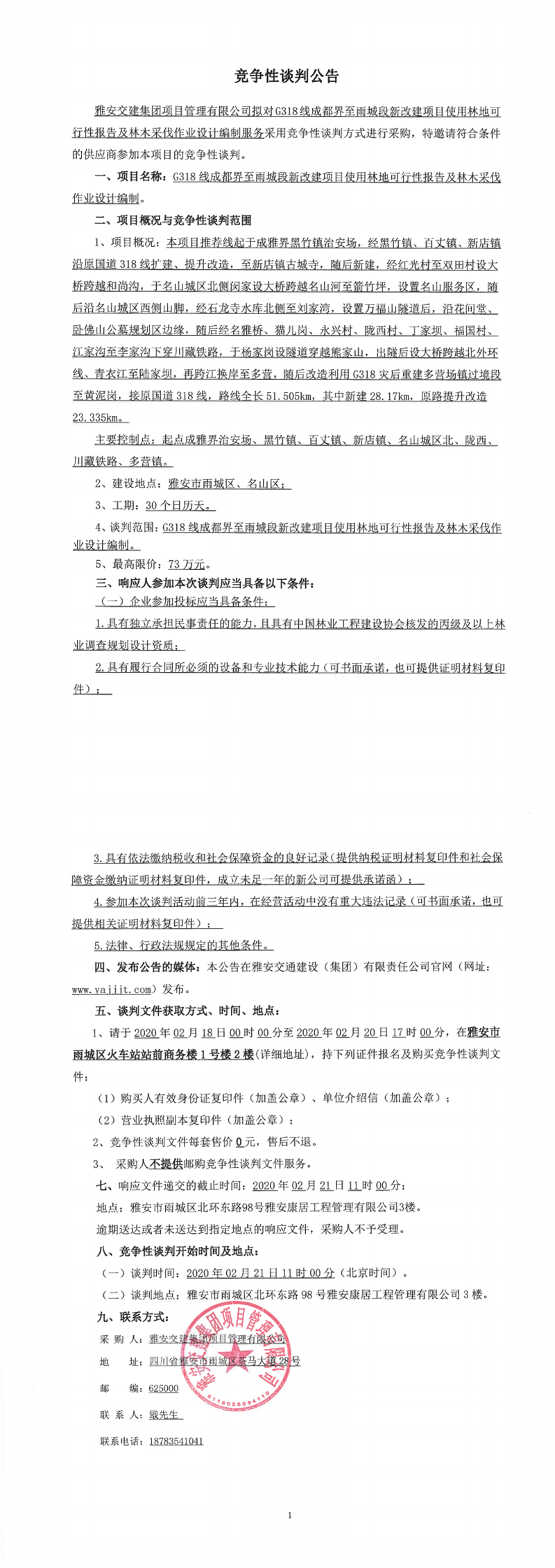 亿万先生MR集团项目管理有限公司G318线成都界至雨城段新改建项目地质灾害危险性评价编制竞争性谈判公告