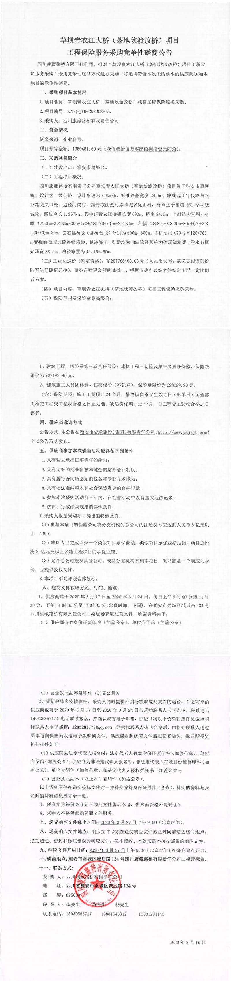 四川康藏路桥有限责任公司草坝青衣江大桥(茶地坎渡改桥)项目工程保险服务采购竞争性磋商公告
