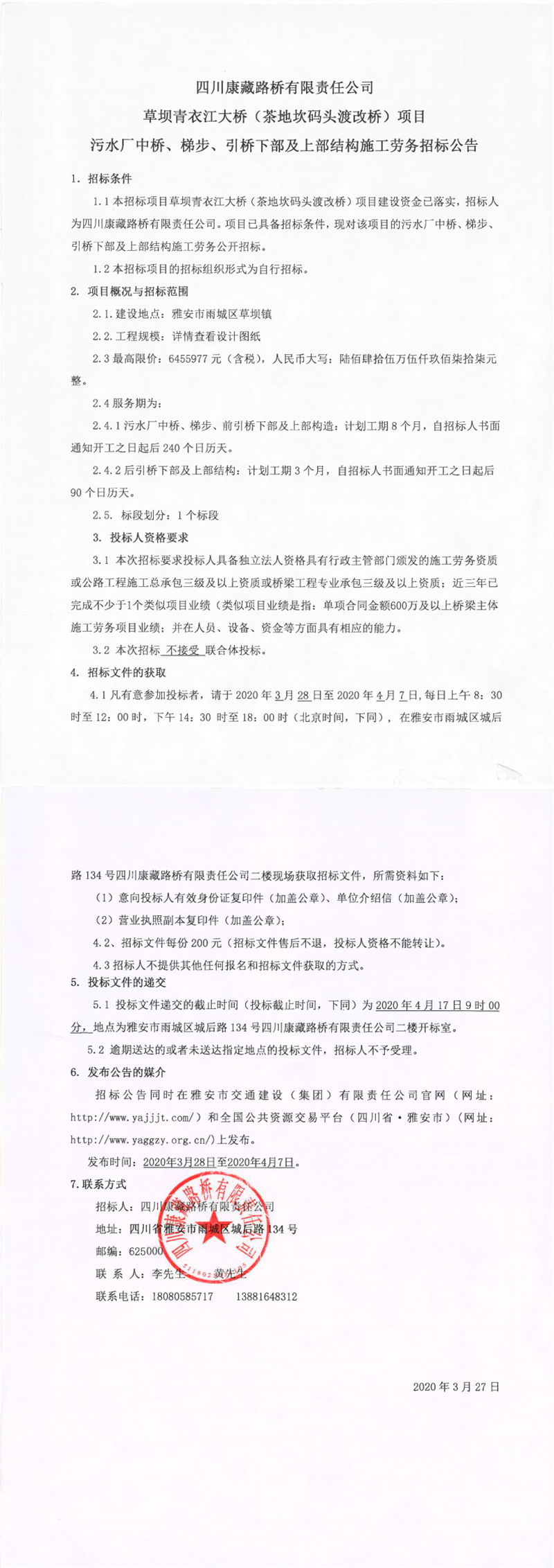 四川康藏路桥有限责任公司草坝青衣江大桥(茶地坎码头渡改桥)项目污水厂中桥、梯步、引桥下部及上部结构施工劳务招标公告