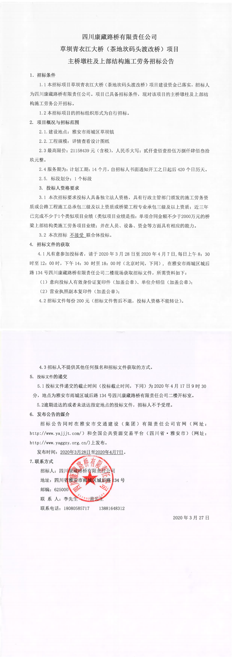 四川康藏路桥有限责任公司草坝青衣江大桥(茶地坎码头渡改桥)项目主桥墩柱及上部结构施工劳务招标公告