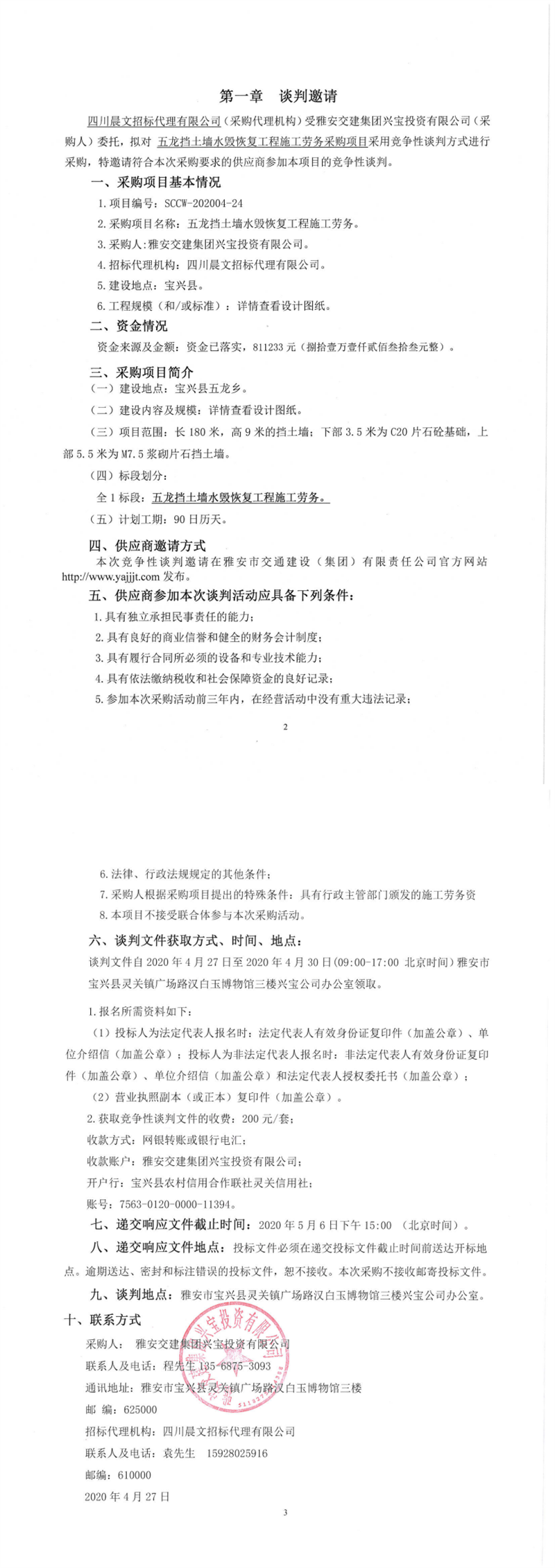 亿万先生MR集团兴宝投资有限公司五龙挡土墙水毁恢复工程施工劳务采购项目竞争性谈判公告
