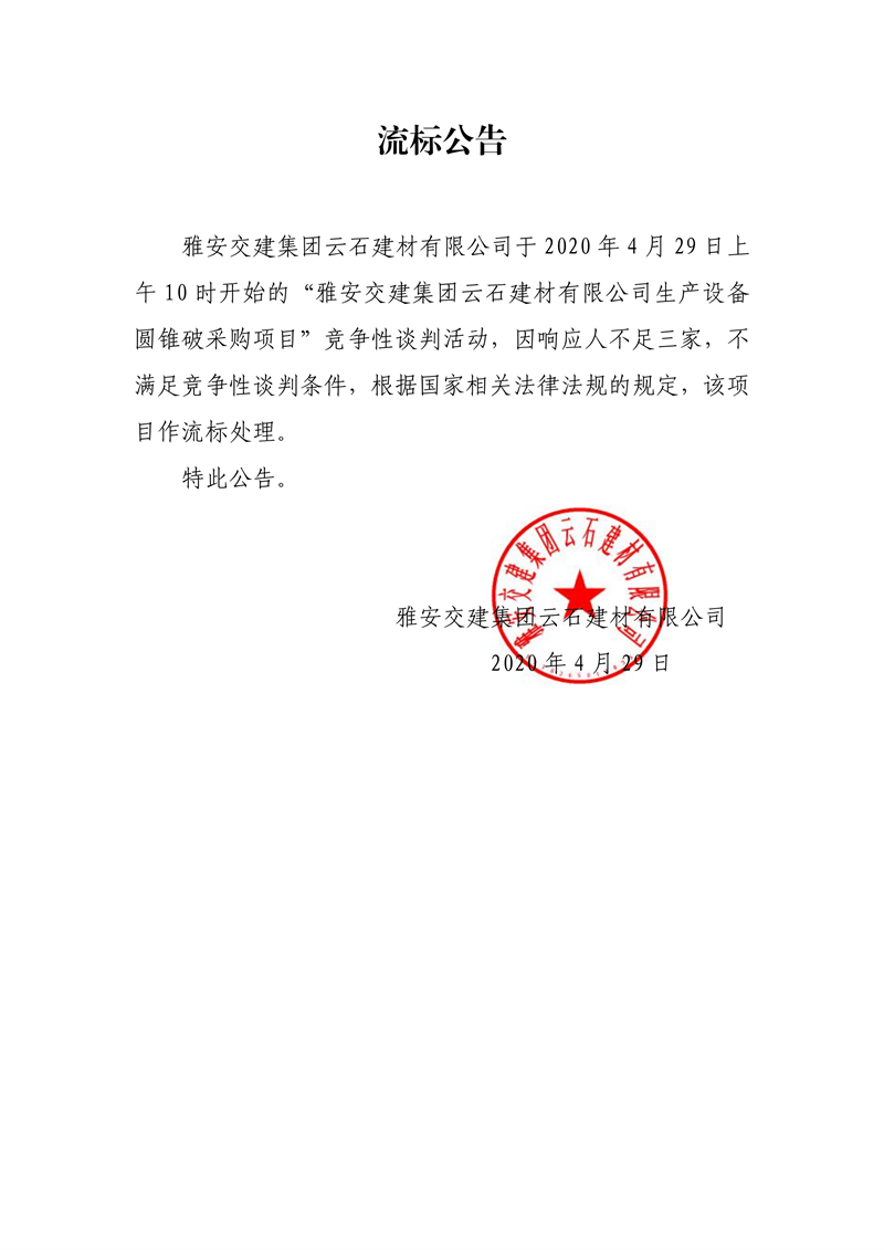 亿万先生MR集团云石建材有限公司生产设备圆锥破采购项目流标公告