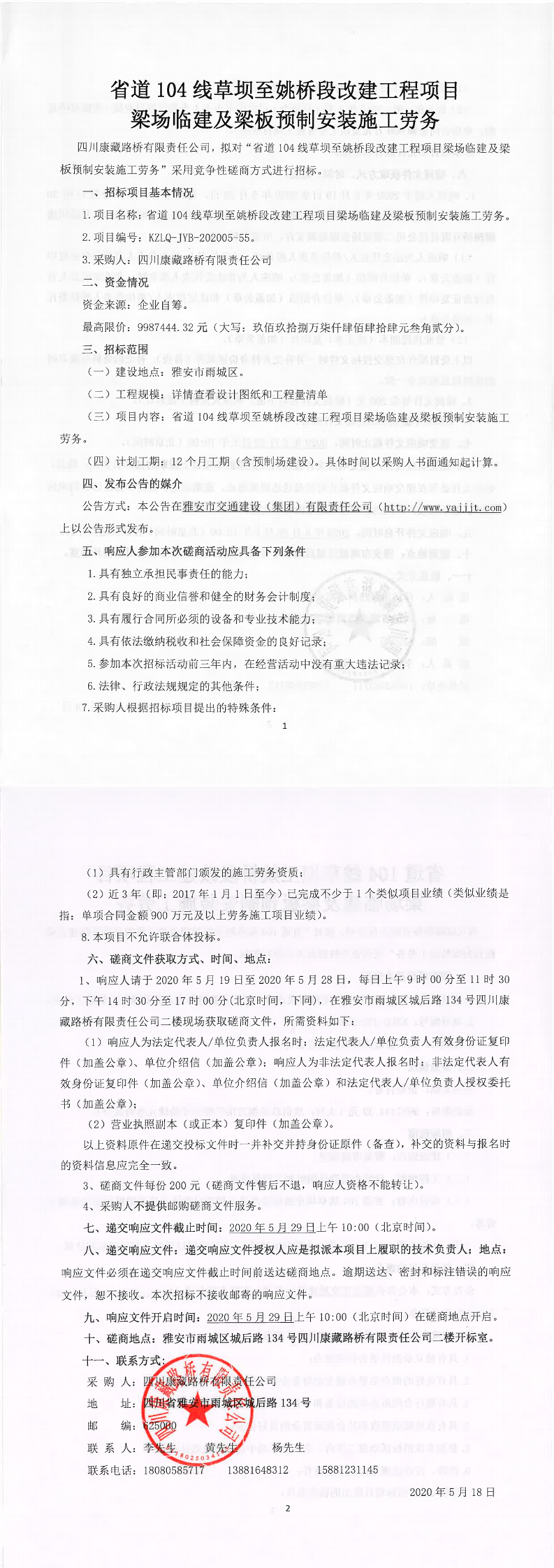 四川康藏路桥有限责任公司省道104线草坝至姚桥段改建工程项目梁场临建及梁板预制安装施工劳务竞争性磋商公告