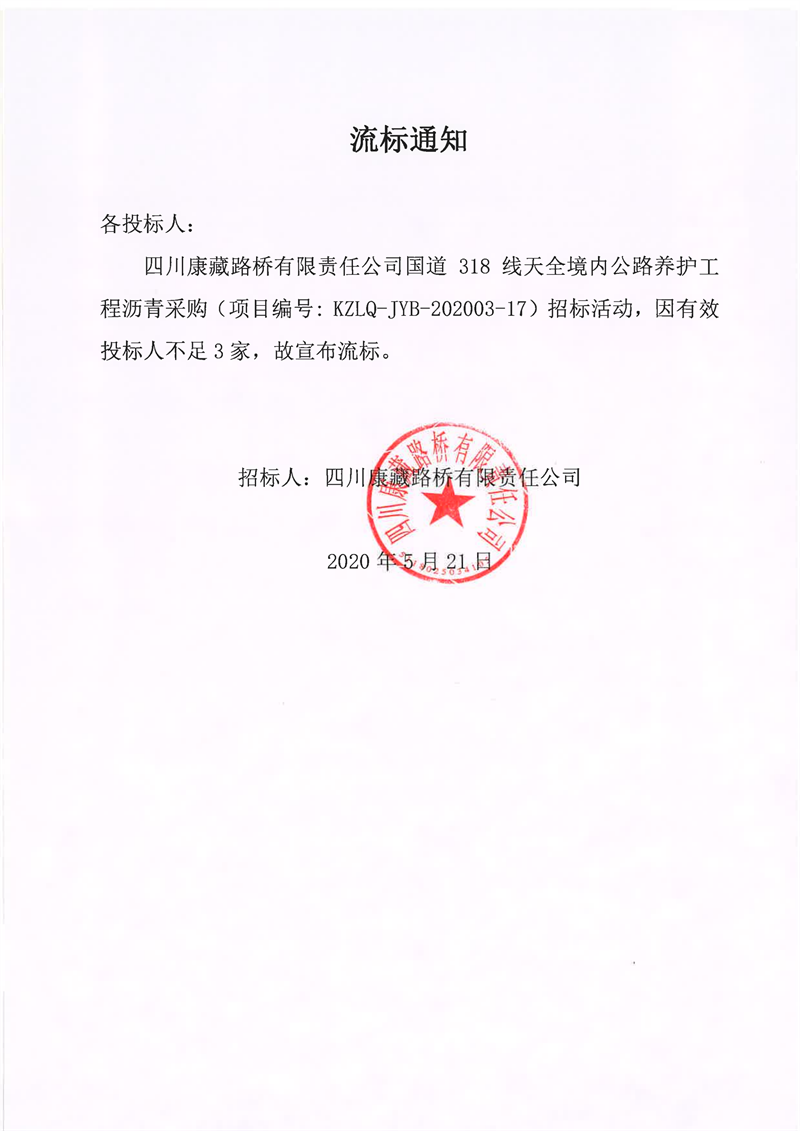 四川康藏路桥有限责任公司国道318线天全境内公路养护工程沥青采购项目流标通知