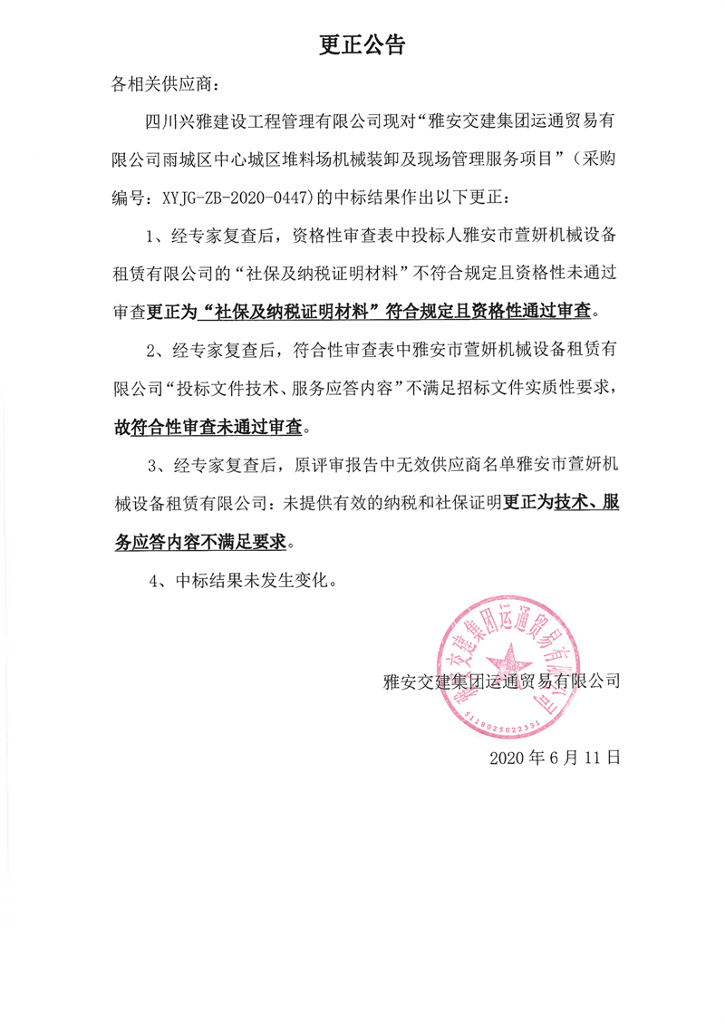 亿万先生MR集团运通贸易有限公司雨城区中心城区堆料场机械装卸及现场管理服务项目更正公告