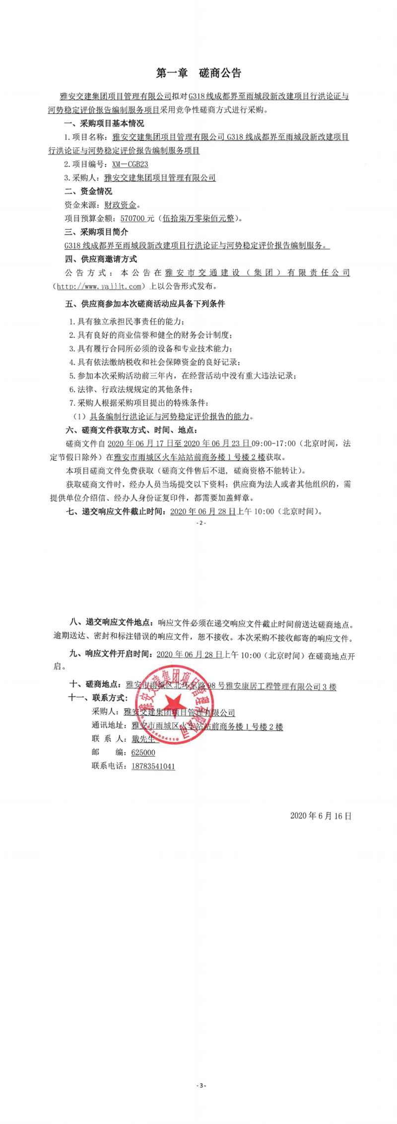 亿万先生MR集团项目管理有限公司G318线成都界至雨城段新改建项目行洪论证与河势稳定评价报告编制服务项目竞争性磋商公告
