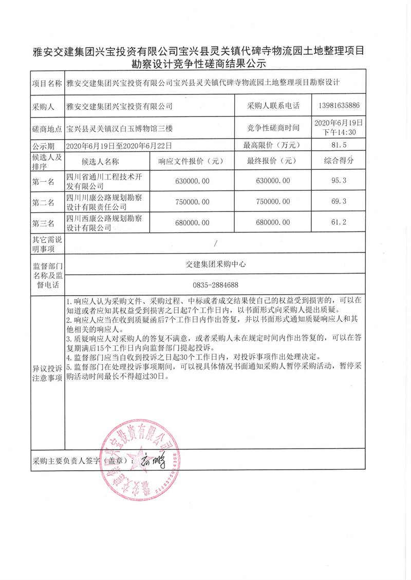 亿万先生MR集团兴宝投资有限公司宝兴县灵关镇代碑寺物流园土地整理项目勘察设计竞争性磋商结果公示