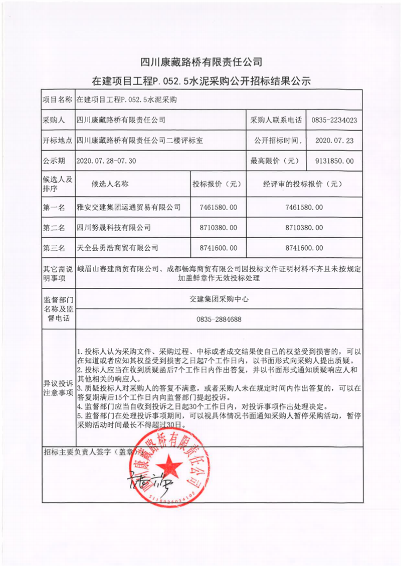四川康藏路桥有限责任公司在建项目工程P.052.5水泥采购公开招标结果公示