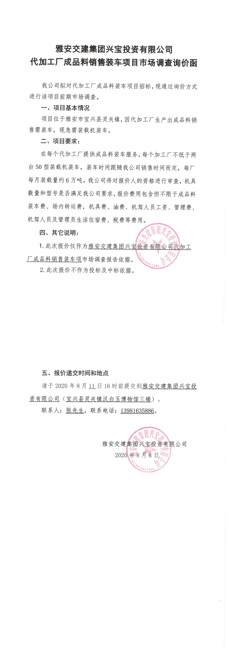 亿万先生MR集团兴宝投资有限公司代加工成品料销售装车项目市场调查询价函
