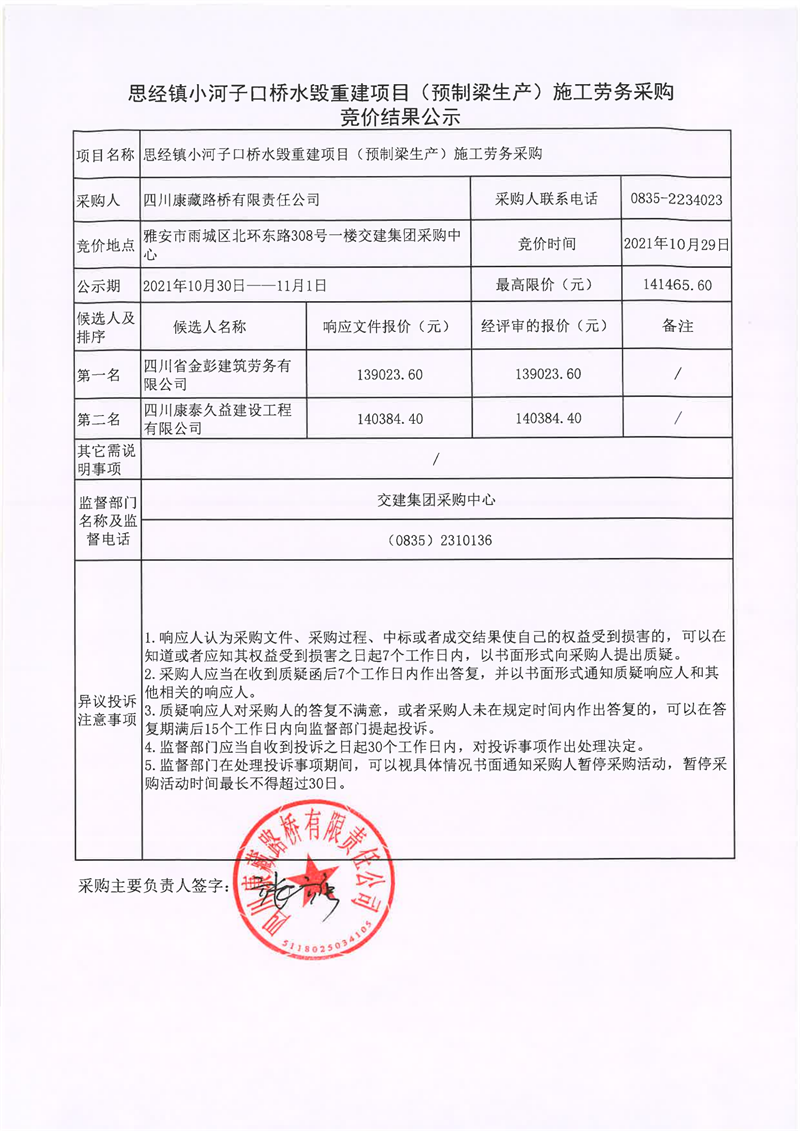 四川康藏路桥有限责任公司思经镇小河子口桥水毁重建项目(预制梁生产)施工劳务采购竞价结果公示