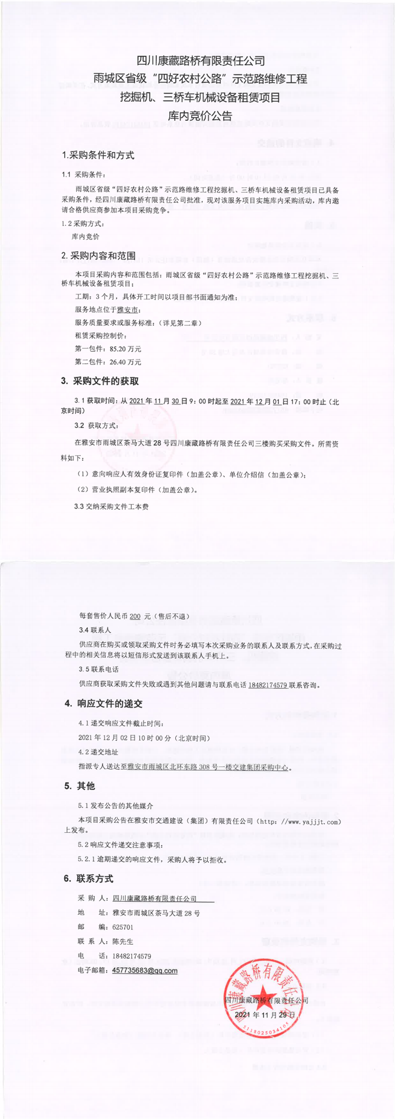四川康藏路桥有限责任公司雨城区省级“四好农村公路”示范路维修工程挖掘机、三桥车机械设备租赁项目库内竞价公告