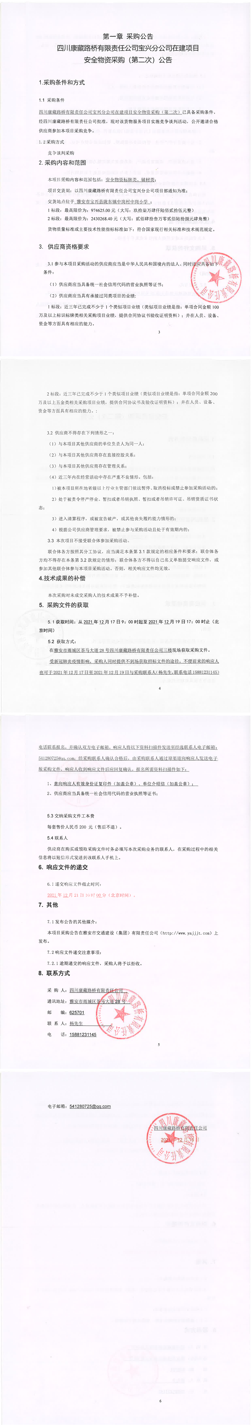 四川康藏路桥有限责任公司宝兴分公司在建项目安全物资采购(第二次)公告