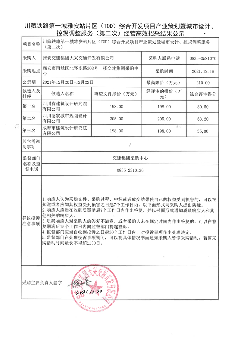 亿万先生MR集团大兴交通开发有限公司川藏铁路第一城雅安站片区(TOD)综合开发项目产业策划暨城市设计、控规调整服务(第二次)经营高效招采结果公示