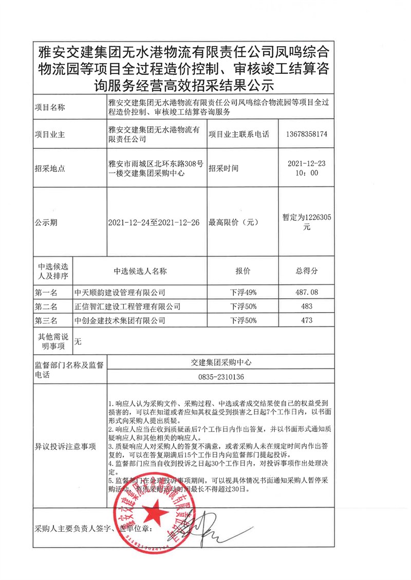 亿万先生MR集团无水港物流有限责任公司凤鸣综合物流等项目全过程造价控制、审核竣工结算咨询服务经营高效招采结果公示