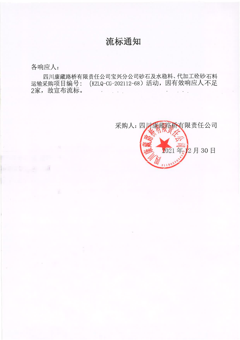 四川康藏路桥有限责任公司宝兴分公司砂石及水稳料、代加工砼砂石料运输采购流标通知