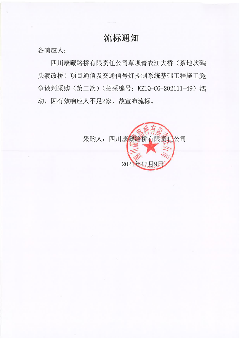 四川康藏路桥有限责任公司草坝青衣江大桥(茶地坎码头渡改桥)项目通信及交通信号灯控制系统基础工程施工竞争谈判采购(第二次)流标通知