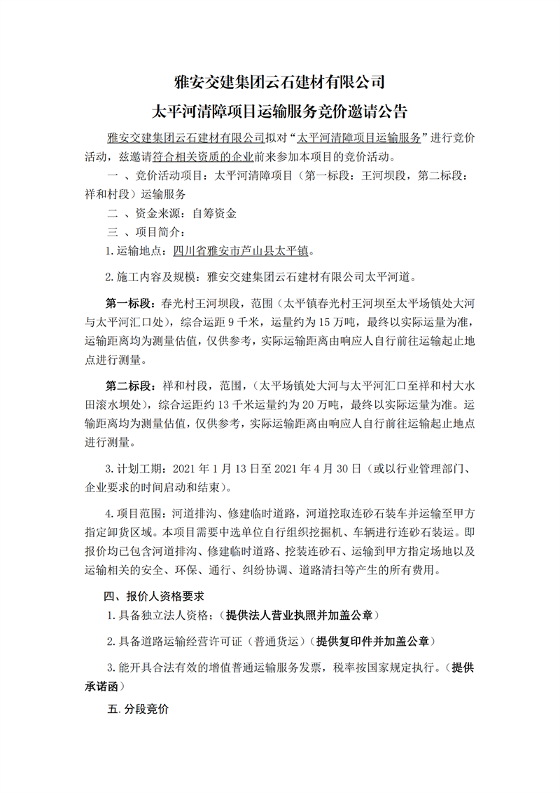亿万先生MR集团云石建材有限公司太平河清障项目运输服务竞价邀请公告