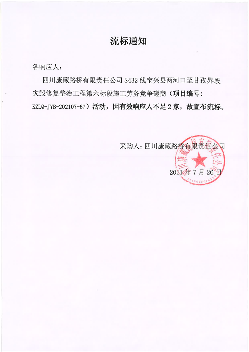 四川康藏路桥有限责任公司S432线宝兴县两河口至甘孜界段灾毁修复整治工程第六标段施工劳务竞争磋商流标通知