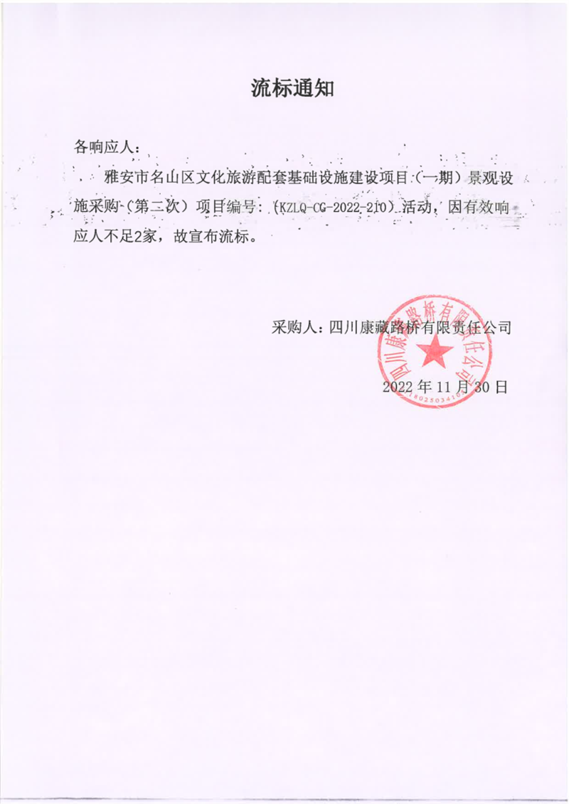 四川康藏路桥有限责任公司雅安市名山区文化旅游配套基础设施建设项目(一期)景观设施采购(第二次)流标通知