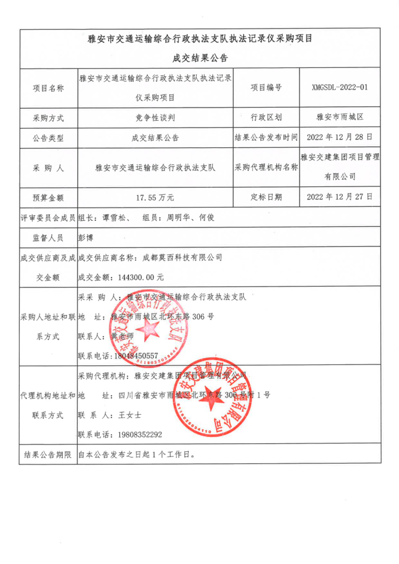 亿万先生MR集团项目管理有限公司雅安市交通运输综合行政执法支队执法记录仪采购项目成交结果公告