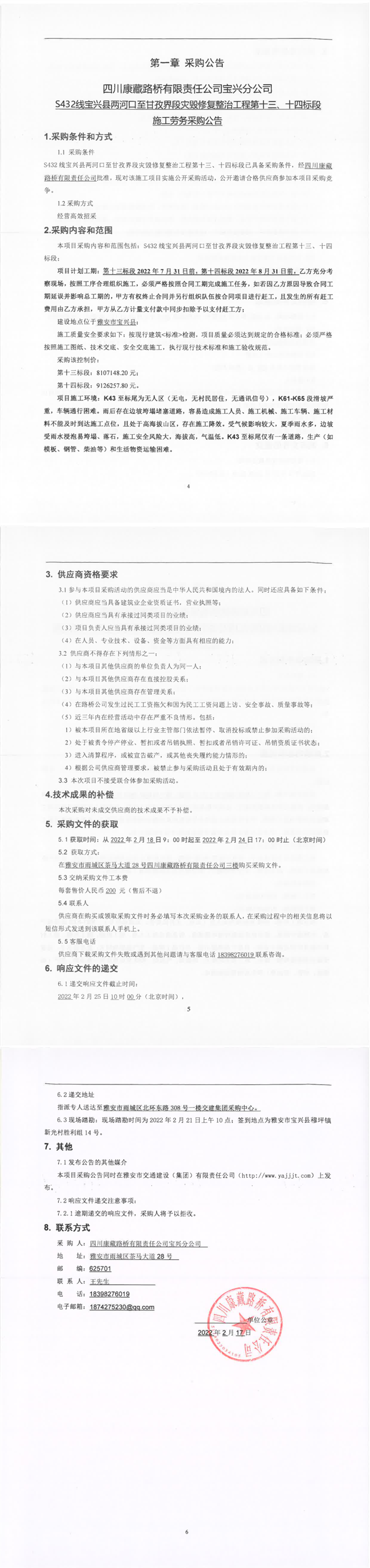 四川康藏路桥有限责任公司S432线宝兴县两河口至甘孜界段灾毁修复整治工程第十三、十四标段施工劳务采购公告