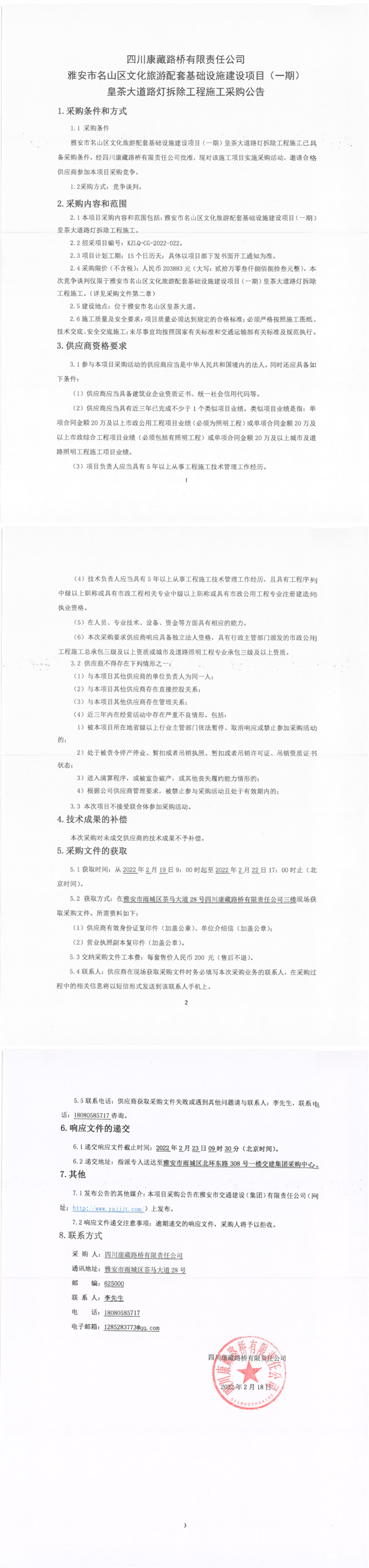 四川康藏路桥有限责任公司雅安市名山区文化旅游配套基础设施建设项目(一期)皇茶大道路灯拆除工程施工采购公告