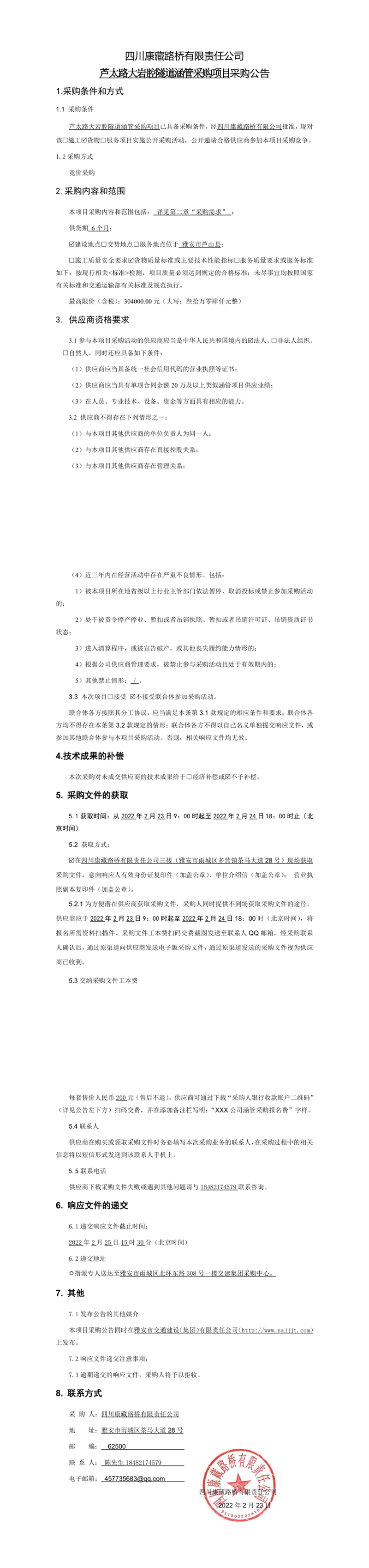 四川康藏路桥有限责任公司芦太路大岩腔隧道涵管采购项目采购公告
