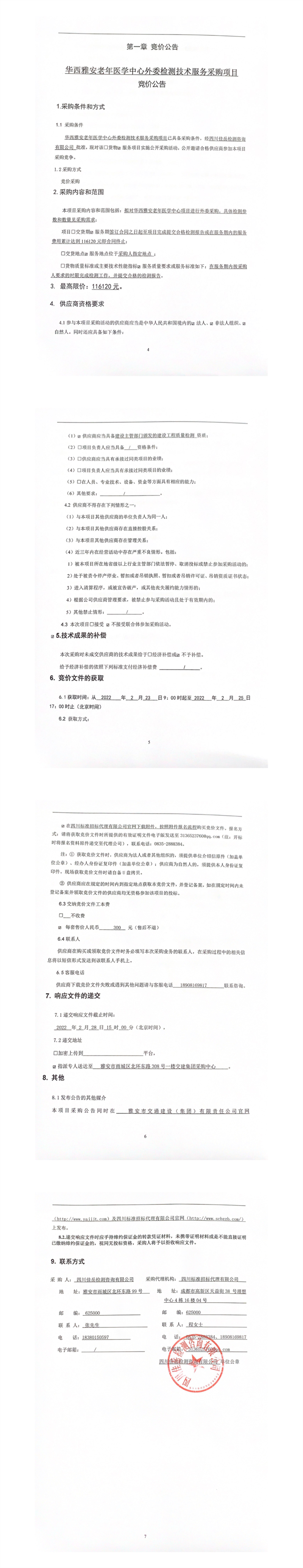 四川佳岳检测咨询有限公司华西雅安老年医学中心外委检测技术服务采购项目竞价公告
