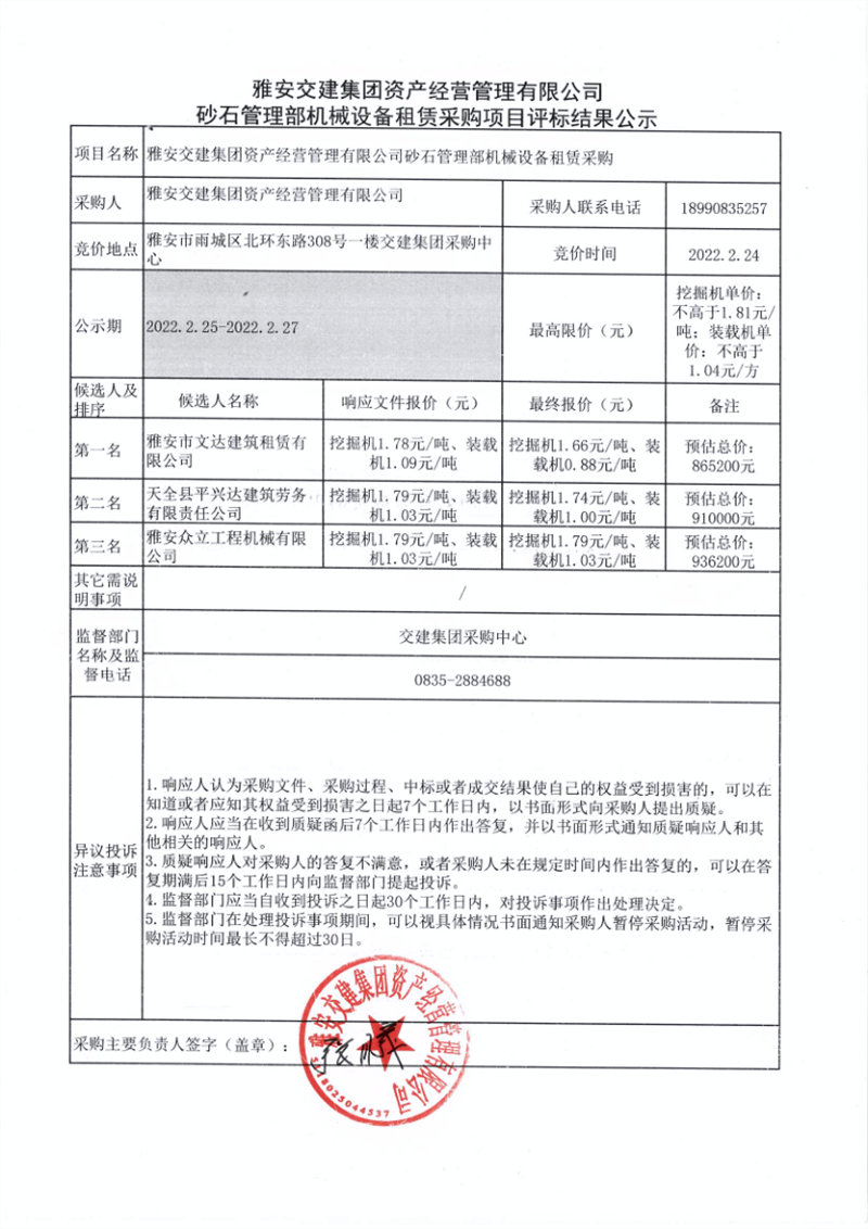 亿万先生MR集团资产经营管理有限公司砂石管理部机械设备租赁采购项目评标结果公示