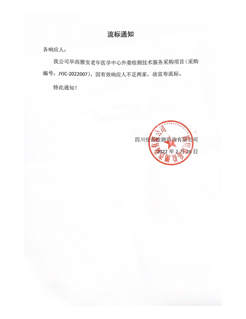四川佳岳检测咨询有限公司华西雅安老年医学中心外委检测技术服务采购项目流标通知