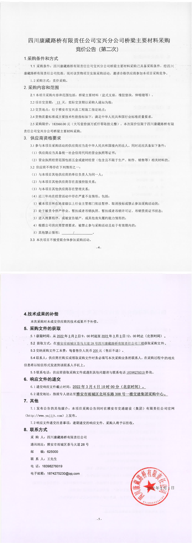 四川康藏路桥有限责任公司宝兴分公司桥梁主要材料采购竞价公告(第二次)