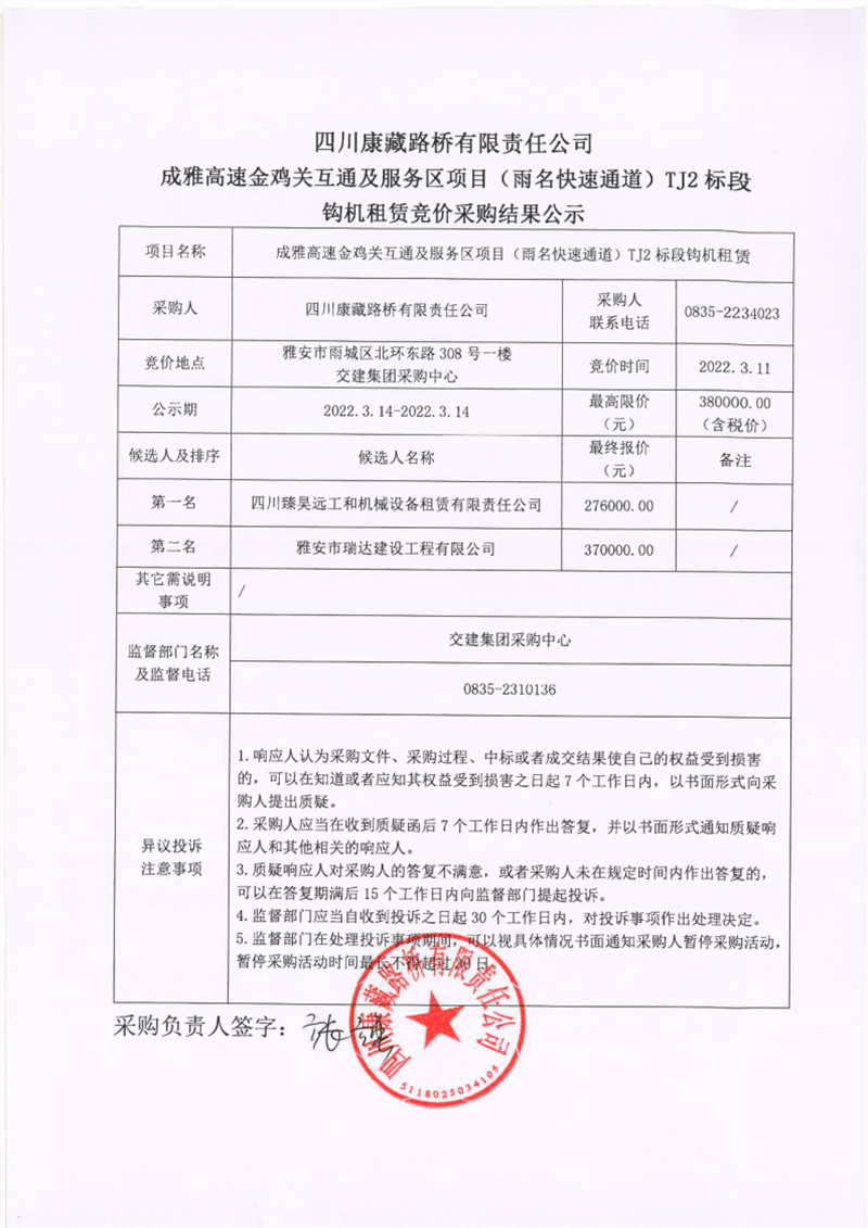 四川康藏路桥有限责任公司成雅高速金鸡关互通及服务区项目(雨名快速通道)TJ2标段钩机租赁竞价采购结果公示