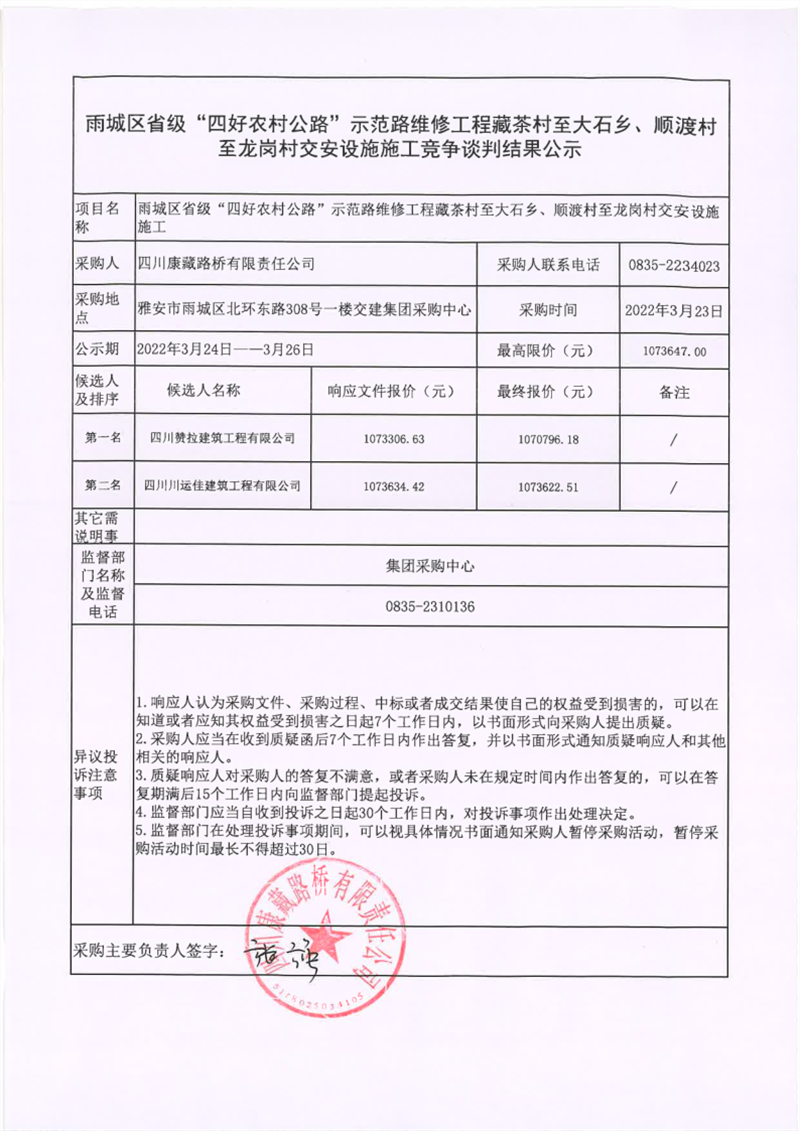 四川康藏路桥有限责任公司雨城区省级“四好农村公路”示范路维修工程藏茶村至大石乡、顺渡村至龙岗村交安设施施工竞争谈判结果公示