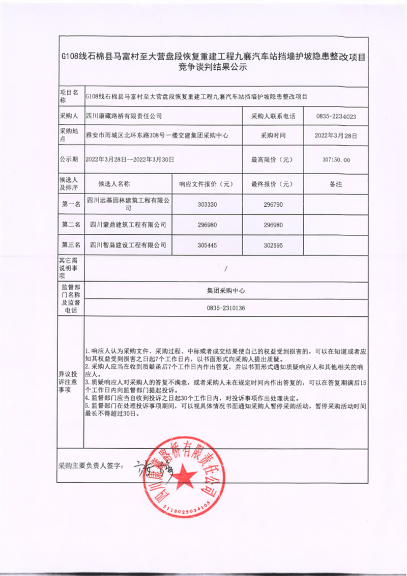 四川康藏路桥有限责任公司G108线石棉县马福村至大营盘段恢复重建九襄汽车站挡墙护坡隐患整改项目竞争谈判结果公示