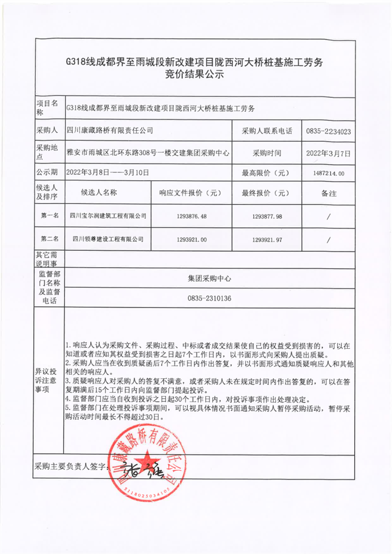四川康藏路桥有限责任公司G318线成都界至雨城段新改建项目陇西河大桥桩基施工劳务竞价结果公示