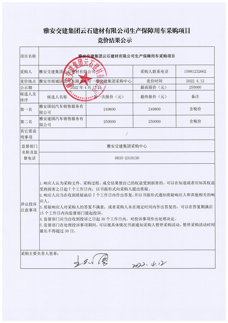 亿万先生MR集团云石建材有限公司生产保障用车采购项目竞价结果公示