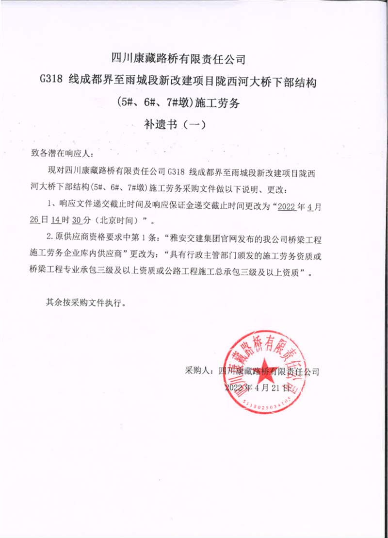 四川康藏路桥有限责任公司G318线成都界至雨城段新改建项目陇西河大桥下部结构(5#、6#、7#墩)施工劳务补遗书(一)