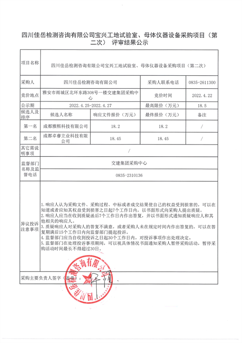 四川佳岳检测咨询有限公司宝兴工地试验室、母体仪器设备采购项目(第二次)评审结果公示